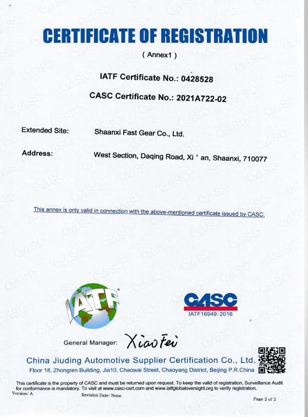 Certificate of Approval This is to cerity that the Quality Management System of: SHAANXI FAST GEAR CO., LTD -